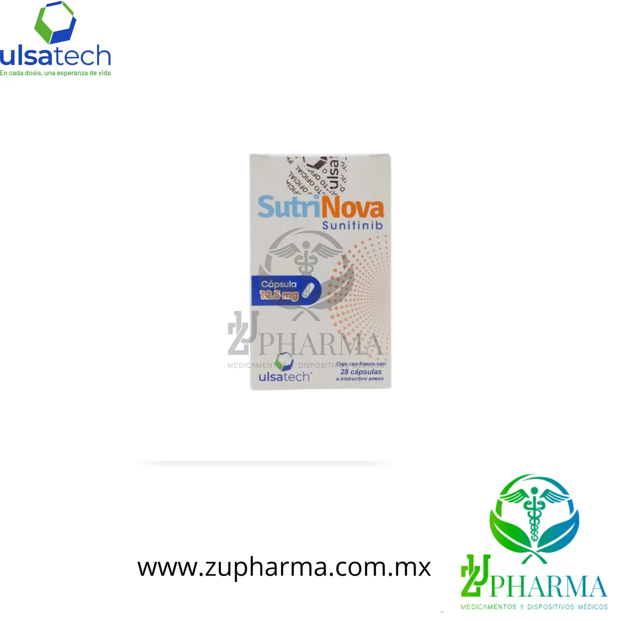 Descripción: SUTRINOVA (Sunitinib). Caja con frasco con 28 cápsulas de 12.5 mg e instructivo anexo. Producto distribuido por Ulsatech.